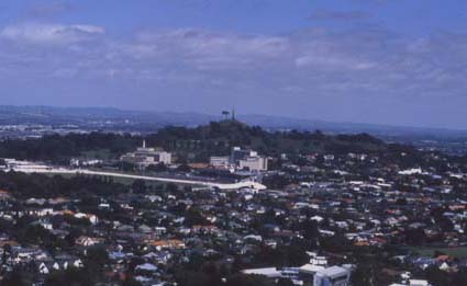 高さ182メートルの One Tree Hill 頂上から北を臨むと、Mt Eden それから シティ 中心部が見え、遠くにランギトト島 (Rangitoto Island) を見ることができます。ここからのランギトト島は美しいという評判です。(ランギトト島の姿が美しいと言われるところがもう一カ所あります。シティから東へ海岸線を走るTamaki Dr. からの眺めです。両方見ることができる人は是非比べてみてください。)