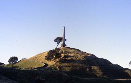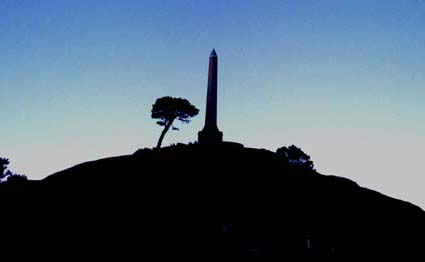 オークランドを象徴するものとして、Harbour Brige、Skytower、One Tree Hill の三つがあります。中でも One Tree Hill の頂上はオベリスクとモントレー松がそびえており、古くはマオリの「Pa (砦)」があったところとして、ニュージーランダー、マオリの人々にとって「こだわりの場所」でもあります。頂上のモントレー松は強風にさらされる頂上でワイヤーローブにより固定されて長年 Auckland を見守り続けていましたが、以前より心ない人に幹を切りられることがあり、松そのものが年老いて安全性を保てないということで、2000年10月惜しまれながら切り落とされました。今現在、頂上にはオベリスクがそそり立つのみとなっています。