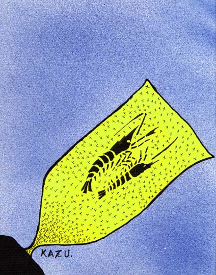 ドウケツエビは幼生の時、カイメンの網目をくぐって体内腔に入り、そこで成体になります。成体の大きさは15ミリという情報もありますが、私の標本の中の残骸からみるともっと大きいように思います。先にカイメンの体内に入って大きい方がオス、後からは入った方がメスになるということで、常に雌雄一対。共に一生をそこで終えます。共生とはいっても片利共生(一方の生物だけが利を得る共生)で、エビは永住の住処とカイメンが作る水流に乗って体内に入ってくるプランクトンのおこぼれを頂戴します。エビの全体像は図鑑にもなかなか載っていないもので、20年ほど前にイラストを描いたときもエビはイメージです。