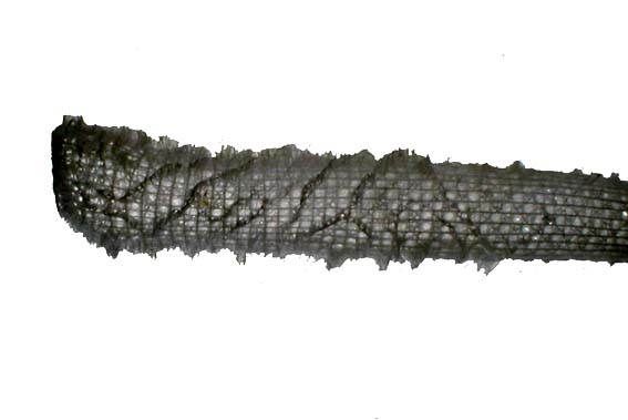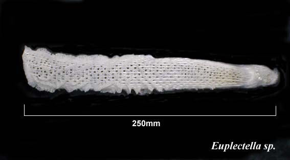 カイロウドウケツは珪質の骨片が網目状になったガラス質のカイメンで、円筒形をしており中が中空になっていて、ちょうどガラス繊維の籠で、網目は2〜3ミリ、中に一対のドウケツエビが共生していることが非常に多いということです。写真はEuplectella属のカイメンで、同定者によると「ヤマトカイロウドウケツ」に間違いないそうです。