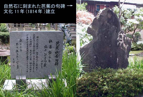 句碑は文化十一年(1814年)に俳人山津人が主宰する月夜庵社が建立したもので、大きな石に刻まれていますが、今は判読が難しいくらいの状態です。寺では新たに記念の句碑をその隣に建てています。残念ですが今ではカキツバタを見ることはできません。戦後栽植されたそうですが活着せず、今はアヤメとキショウブが植えられています。