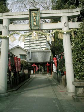 聖天さんに行くときはいつもパン屑か麸を持ってでかけました。私のお目当ては池の亀でした。現在の池は最近手直しされたようで、コンクリート打ちされて余り昔の面影はないのですが、池の中州に橋が渡され祠には弁財天が祭られ、池の中央には大きな龍王があり、水掛け不動さまとこの龍は子供には怖い存在でした。池の周りには柵が設けられており、そこからのぞきこんで、パンや麸を投げてやると亀が泳いで来て食べました。中州のあたりには亀が甲羅干しをしていました。野生の亀ならのぞきこむとすぐに水の中に入ってしまいますが、聖天さんの亀はのぞいても悠然と甲羅干しを続けていて好きでした。亀の種類は全部クサガメだったでしょう。また、当時は鳩も多くいました。最近はどことも鳩は糞公害で追い出されて少なくなりました。鳩もパンを投げると沢山やってきました。
