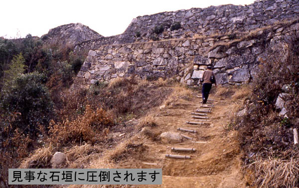 ここの見どころは堅固な石垣です。現在残っているのは石垣のみですが、天守台まで上がると、南米の空中都市を思い起こす様な見事な石組みの城が浮かび上がってきます。よくぞこんな山の上まで石を運んで築いたものだと感心します。