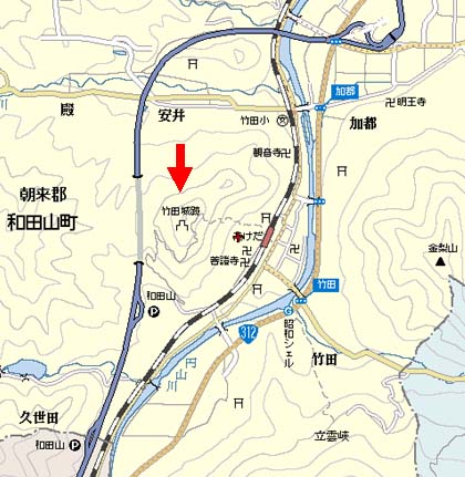 JR山陰線和田山駅から播但線で南に下ると一つ目の駅が竹田。この竹田の駅を過ぎて右手の山の上に石垣が見えてきます。自動車だと国道312号線を走ると道の西側の山腹から山頂に連なる石垣、これが竹田城です。