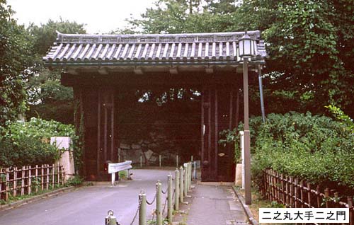 表通りの二之丸交差点から撮影。向こうの方に二之丸大手二之門が見えています。