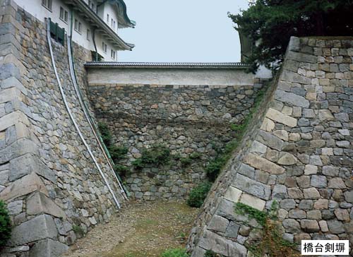 大小天守閣を結ぶ橋台の西側にあり、廂に槍の穂先を並べた忍返しを備えた塀。