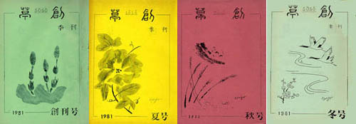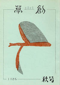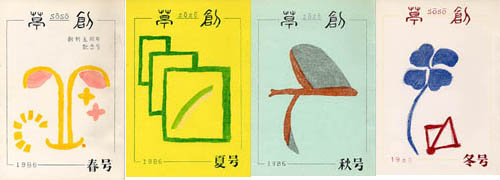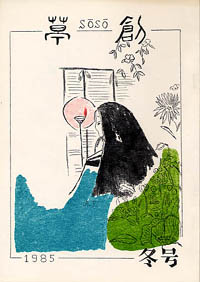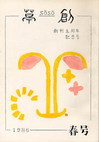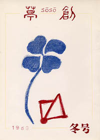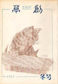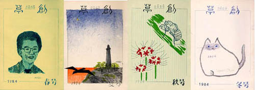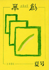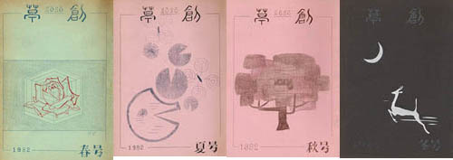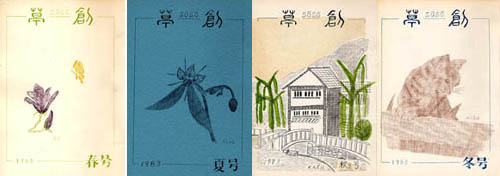 「草創」は1981年私と友人正吾氏の2人が発起人となり、友人4人で創刊した文芸同人誌です。発行は季刊で年4回(3、6、9、12月1日)発行、体裁はB5版。本文は当初は孔版(ガリ版)刷り、後にオフセット・コピー版としましたが、表紙は最終号以外は孔版刷(孔版版画・プリントゴッコ)で作成しました。