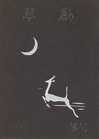 この秋号は題字部分はヤスリ製版を使ったが、画の方は毛筆原紙だけを使ってみた。毛筆原紙は和紙に樹脂が塗ってあり、これを毛筆につけた薬品で溶かすことによって製版する孔版用の原紙。やわらかい面塗りが簡単に表現できる。半面重厚さがあまりないので、この作品は失敗かなと思っている。