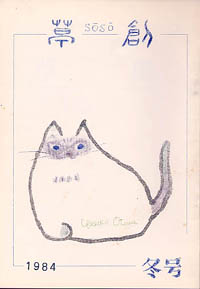 創刊号〜4号までは模写、以後オリジナルを続けたが、今回は久しぶりに模写。原画は大学の友人であり、また会員でもある○○靖子さんのもの。モデルはオスのシャム猫「ランディ」。画材は水彩とパスである。